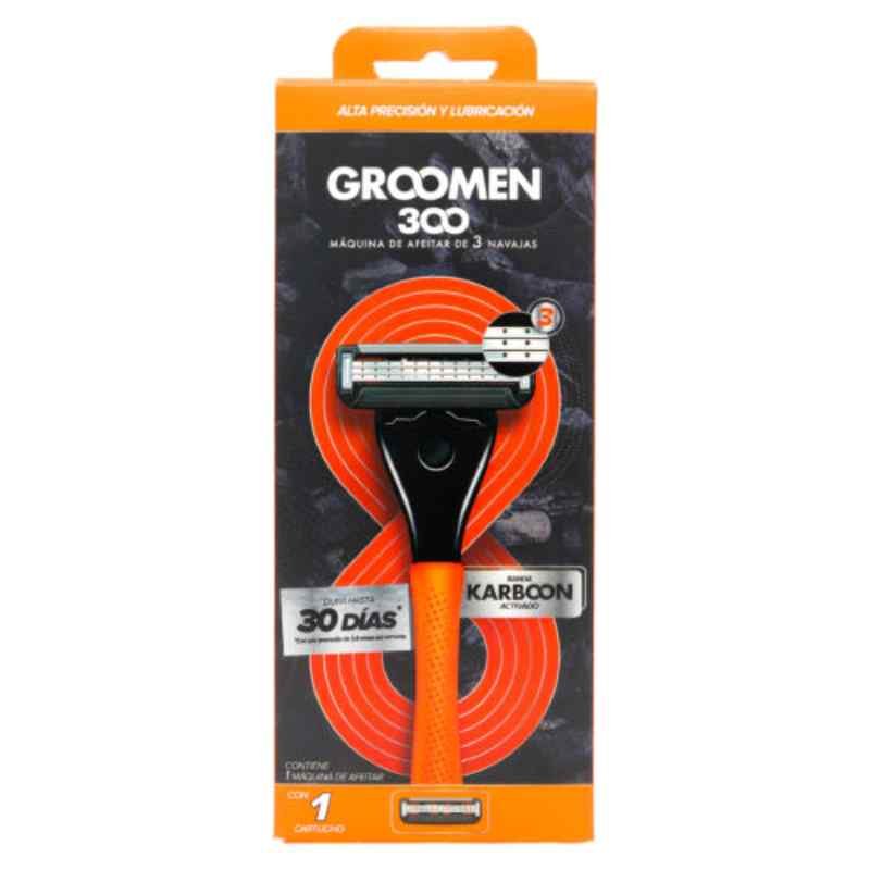 Groomen 300 es una máquina de afeitar con 3 navajas de alta precisión y lubricación que, gracias a su banda superior con carbón activado y su banda inferior con vitamina E y aloe vera, ayuda a proteger la piel contra el enrojecimiento y reducir la irritación mientras te afeitas. Beneficios Cartuchos anti obstrucción para enjuagar rápidamente Mango de goma para mejor agarre y menos deslizamiento. Lubricación antes y después de las navajas para ayudar a reducir la irritación durante la afeitada. Agentes lubricantes probados dermatológicamente. 30 días de rasuradas.